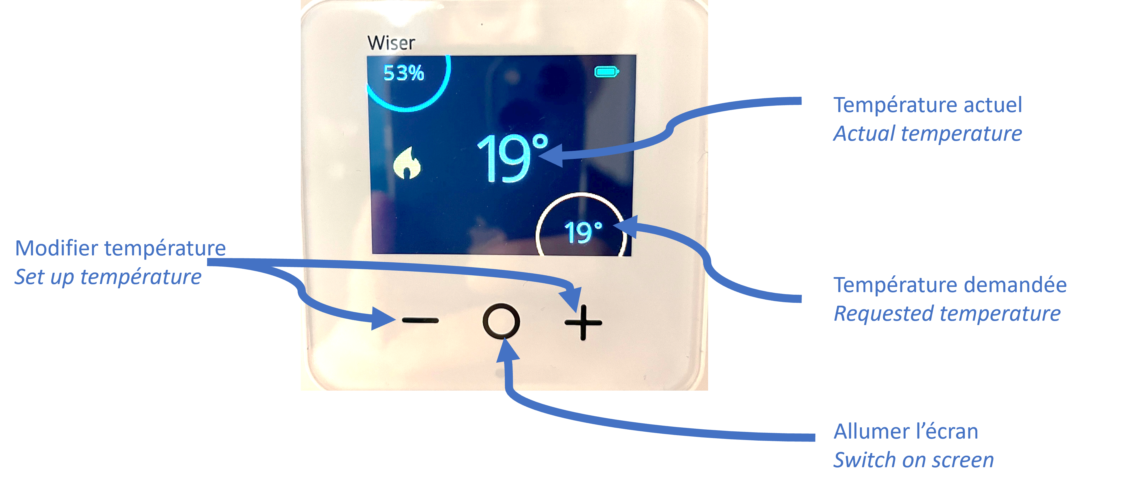 La salle de bain, la chambre et le séjour sont équipés de thermostats de contrôle :